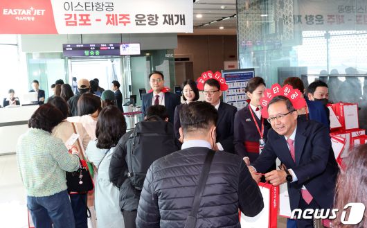 (서울=뉴스1) 박정호 기자 = 조중석 이스타항공 대표(오른쪽)와 유상종 경영총괄 전무, 이경민 커머셜본부장 및 승무원들이 26일 오전 김포국제공항 국내선 탑승 게이트에서 승객들에게 기념 굿즈를 전달하고 있다. 이스타 항공은 오늘부터 김포-제주 노선을 시작으로 3년 만에 운항을 재개했다. (공동취재) 2023.3.26/뉴스1