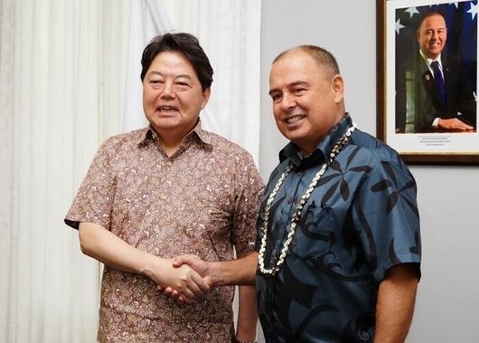 하야시 요시마사(사진 왼쪽) 일본 외무상이 21일 태평양 섬나라인 쿡제도를 방문해 마크 브라운 총리와 악수를 하고 있다. 일본 외무성 누리집. |