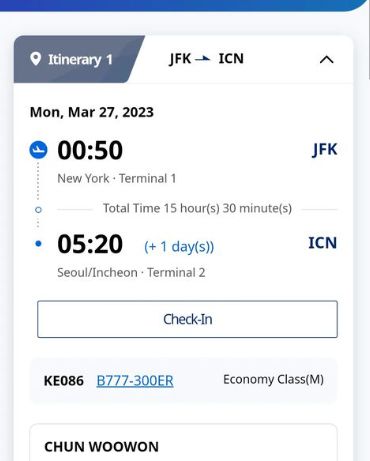 전 씨는 자신의 SNS를 통해 내일(27일) 미국 뉴욕공항을 떠나, 모레 새벽 인천국제공항에 도착한다는 내용의 비행기 예약 내역을 게시했다.