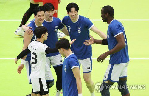 (수원=연합뉴스) 홍기원 기자 = 26일 경기도 수원실내체육관에서 열린 프로배구 V리그 남자부 플레이오프 2차전 한국전력 빅스톰과 현대캐피탈 스카이워커스의 경기. 득점에 성공한 현대캐피탈 선수들이 기뻐하고 있다. 2023.3.26