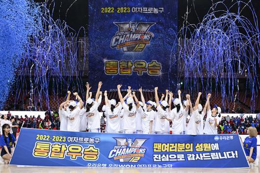 사진=WKBL 제공/ 우리은행이 2022∼2023시즌 통합우승을 달성한 뒤 기쁨을 만끽하고 있다.