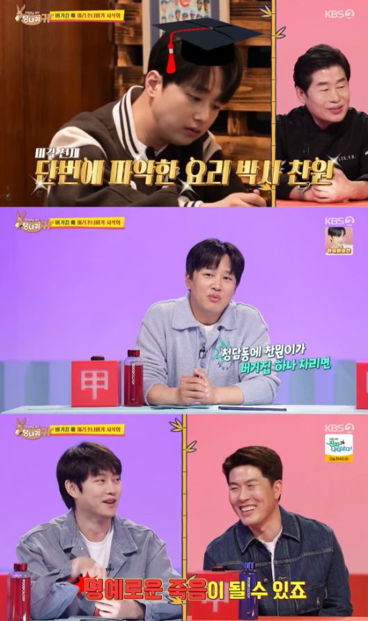 그러자 김병현은 "무슨 말이냐. 내 밑으로 와야지"라고 답했다. 이를 본 차태현은 "찬원이가 청담동에 버거가게를 차리면 BK는 망한다", 전현무는 "굳이 찬원이가 나서지 않아도 그렇게 된다", 김희철은 "찬원이가 나서면 그나마 명예로운 죽음이 된다"라고 해 웃음을 안겼다.