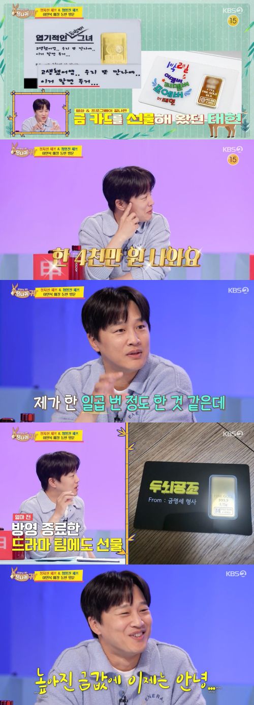 이에 김희철이 “이제는 드라마 촬영장에 C팀까지 생기지 않았느냐”고 묻자, 차태현은 “금값이 비싸고 스태프도 늘어나서 이제 (카드형)골드바 선물은 안 하려고 한다”고 답했다.