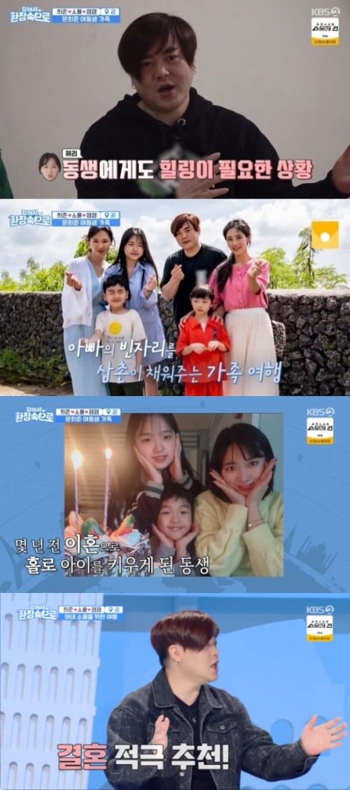 그는 동생의 이혼 사실을 밝히며 “몇 년 전부터 혼자 아이를 케어해야 하는 상황”이라고 말했다. 이어 “일하고 집에 가면 육아 전쟁이더라. 동생도 힐링이 필요하다"라고 함께 여행하는 이유를 밝혔다.