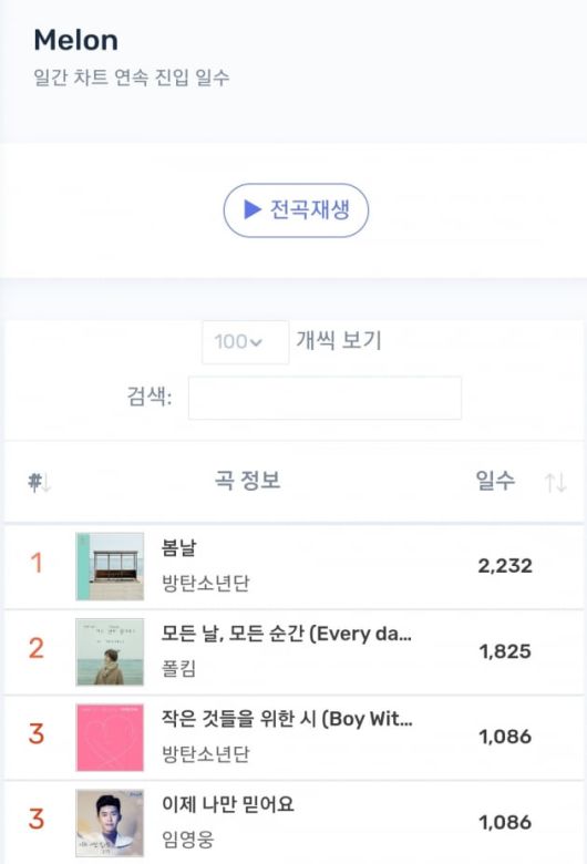 임영웅은 3월 26일 기준 국내 주요 음원 플랫폼 멜론(Melon) 일간 차트에 연속 진입 1086일째 이며 역대 3위에 해당하는 기록을 세우고 있다.