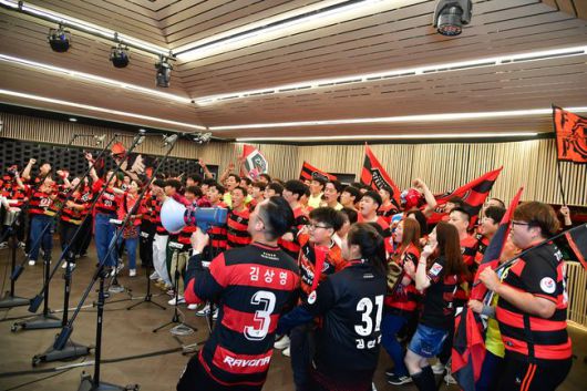 지난 25일 오전 연습경기를 마친 포항 선수단은 창단 50주년 기념 클럽송을 녹음하기 위해 경상북도콘텐츠진흥원에서 운영하는 ‘경북음악창작소’로 향했다. 경주에 위치한 경북음악창작소에는 ‘강철전사’, ‘토르치다’, ‘무한열정3040’ 등 40여명의 포항 서포터즈가 먼저 도착해 클럽송 녹음 작업을 진행 중이었다. 반갑게 인사를 나눈 포항 선수단과 서포터즈는 같은 날, 같은 공간에서 창단 50주년 기념 클럽송 녹음을 완료하였다.