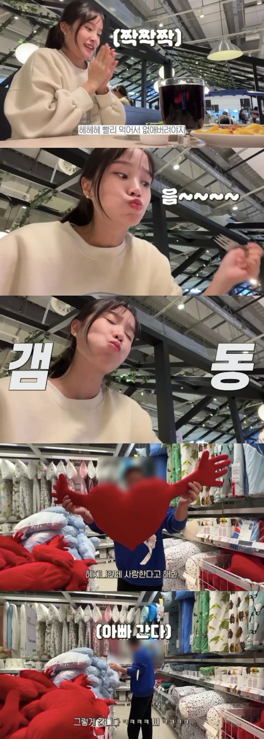 헤이지니는 매장 한쪽에서 하트 모양 쿠션을 만지는 남편에게 “사랑한다고 해봐. 과연 결혼 5년차 남편은”이라고 요구했으나 남편은 1초 만에 인형을 던지고 등을 돌려 웃음을 자아냈다.