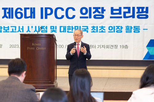 (서울=연합뉴스) 이회성 유엔 '기후변화에 관한 정부 간 협의체'(IPCC) 의장이 27일 서울 중구 프레스센터에서 열린 기자회견에서 IPCC 제6차 평가보고서 종합보고서 시사점을 설명하고 있다. 2023.3.27 [기상청 제공. 재판매 및 DB 금지]
