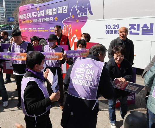 10·29 이태원 참사로 딸을 잃은 송진영씨의 외침이 울려 퍼졌다. 27일 오전 서울 중구 서울광장 분향소 앞에서 10·29 이태원참사 유가족 협의회와 시민대책회의가 ‘진실을 찾는 10일간의 순례 10·29 진실버스 출발 기자회견’을 진행했다. 10·29 진실버스는 서울을 출발해 청주, 전주, 광주, 창원, 부산, 제주, 대구, 대전 등 전국 11개 도시를 순회하며 시민들과 직접 만나 이태원 참사 진상규명을 위한 독립적 진상조사기구 설치 특별법 국민동의청원 참여를 호소할 예정이다. 특별법에는 독립적 진상규명 기구인 특별조사위원회 설치·참사의 발생원인, 수습과정, 후속조치 등 사실관계와 책임소재 진상규명·피해자의 권리 구제 및 재발방지 대책 수립 등의 내용이 담긴다. 순례 마지막 날인 4월5일에는 참사 현장인 이태원역 1번 출구 앞에서 추모 행사를 가진 뒤 10·29 이태원 참사 159일 추모대회가 열리는 서울광장 분향소까지 행진해 돌아올 계획이다. 버스에 오르는 유가족과 시민대책위원들의 뒷모습에 함께 가지 못하는 이들의 마음이 더해진다. “10·29 이태원 참사 그날의 진실 밝히겠습니다”