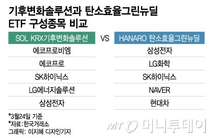 'SOL KRX기후변화솔루션 ETF(상장지수펀드) 1년 수익률 24.38%' vs 'HANARO 탄소효율그린뉴딜 ETF' -12.42%
