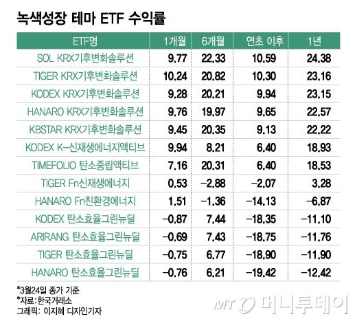 이 중 1년 수익률이 가장 높은 상품은 기후변화솔루션 ETF다. 'TIGER KRX기후변화솔루션 ETF'의 수익률은 24.38%로 SOL KRX기후변화솔루션 ETF에 이어 두 번째로 높다. 이후 'KODEX KRX기후변화솔루션 ETF'(수익률 23.15%), 'HANARO KRX기후변화솔루션 ETF'(22.57%), 'KBSTAR KRX기후변화솔루션 ETF'(22.22%) 순이다.