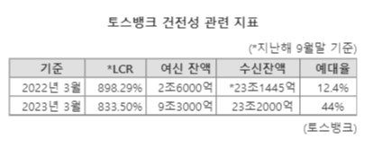 이에 토스뱅크는 이날 보도자료를 통해 유동성커버리지비율(LCR)이 833.5%에 달한다며 은행 평균(100%)에 비해 크게 높다고 강조했다. LCR은 향후 1개월간 순현금 유출액에 대한 현금·국공채 등 고유동성 자산의 비율이다. 30일간 뱅크런이 나타날 가능성에 대비해 은행이 즉시 현금화할 수 있는 자산이 얼마인지 나타내는 지표다.