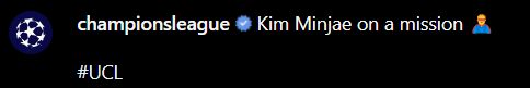 UEFA는 영상과 함께 '김민재는 임무 중(Kim Minjae on a mission)이라는 코멘트와 함께 '슈퍼맨' 이모티콘을 붙였다.