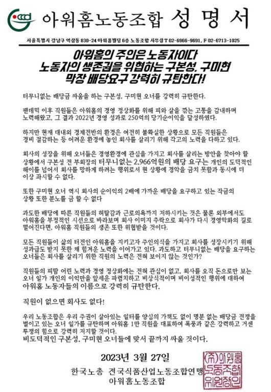 27일 한국노총 전국 식품산업연맹노동조합 소속 아워홈 노조(위원장 장덕우)는 성명을 내어 “회사의 경영환경에 관심을 가지고 회사를 살리는 방안을 찾아야 할 상황에서 구본성 전 부회장의 터무니없는 2966억원 배당요구는 개인의 도덕적 해이를 넘어 회사를 망하게 하는 행위로 경악을 금치 못한다”며 “구미현 오너 역시 회사 순이익의 2배에 가까운 배당을 요구하는 작금의 상황에 분노를 금할 수 없다”고 비판했다. 노조는 이들의 이같은 요구에 대해 “직원의 허탈감을 불러오고 근로의욕을 저하시키는 것은 물론 회사의 이미지 추락으로 인한 경영 악화를 불러올 악재”라고 규정했다.