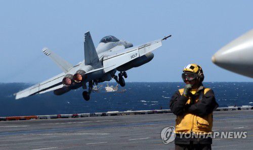 (제주=연합뉴스) 한미 해군 연합 해상훈련이 열린 27일 제주 남쪽 공해상에 진입한 미 핵추진 항공모함 '니미츠'(CVN 68·10만t급)에서 F/A-18F 슈퍼호넷 이함 훈련이 진행되고 있다.