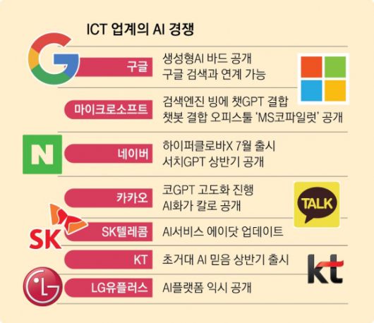 국내에서는 네이버와 카카오 등 양대 포털기업과 SKT, KT, LG유플러스 등 통신 3사가 신성장 동력으로 생성형 AI를 지목하며 개발에 속도를 내고 있다. 모두 챗GPT의 후발 주자이지만 한글 학습과 결과 도출에 있어 압도적인 비교 우위를 자신한다.