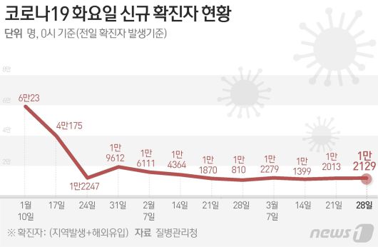 (서울=뉴스1) 윤주희 디자이너 = 질병관리청 중앙방역대책본부(방대본)는 28일 0시 기준 신종 코로나바이러스 감염증(코로나19) 신규 확진자가 1만2129명 발생했다고 밝혔다.ajsj999@news1.krCopyright ⓒ 뉴스1. All rights reserved. 무단 전재 및 재배포 금지.
