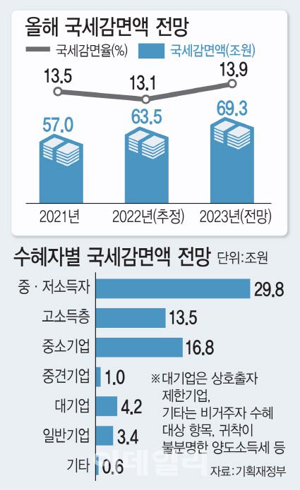 기본계획에 따르면 올해 국세감면액 전망치는 69조3000억원으로 집계됐다. 작년 63조5000억원 보다 9.1%(5조8000억원) 늘어난 규모로 사상 최대치를 다시 경신했다. 국세수입 총액은 428조6000억원으로 전년(421조2000억원)대비 1.76%(7조4000억원) 증가할 것으로 예측했다.