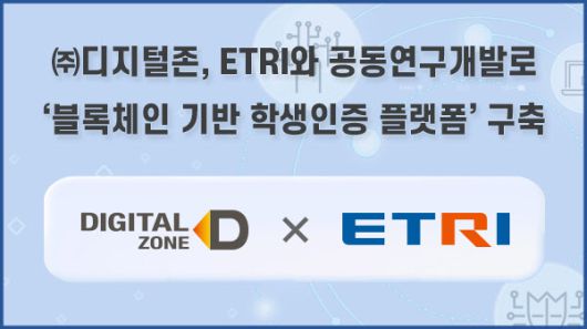[이데일리 이윤정 기자] ㈜디지털존은 한국전자통신연구원(ETRI)과 공동연구개발을 수행 중인 ‘데이터 경제를 위한 블록체인 기술개발 사업(2021년~2025년, 전문기관 IITP)’을 통해 ‘블록체인 기반 학생인증 플랫폼’을 구축했다고 28일 밝혔다.