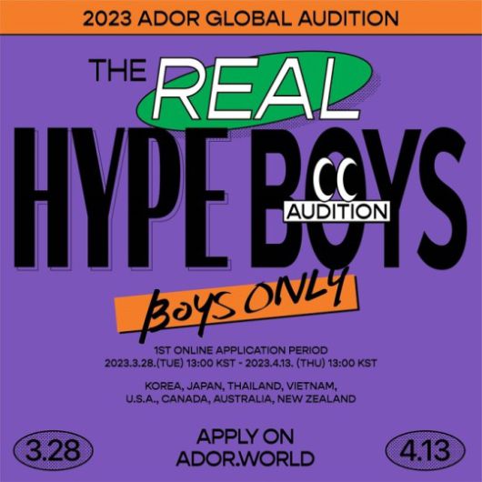 ‘2023 ADOR Global Audition - The Real Hype Boys -’ 접수는 공식 홈페이지를 통해 가능하다. 오디션에 대한 그 밖의 자세한 사항도 홈페이지에서 확인할 수 있다.