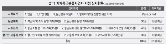 영상물등급위원회는 내달 20일까지 OTT 자체등급분류 사업자 지정 신청을 받는다. 심사기준은 자체등급분류 절차 운영계획, 사후관리 운영계획, 청소년·이용자 보호계획 등이다. 〈본지 2월 7일자 19면 참조〉