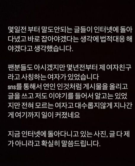 이어 “몇 년 전부터 제 여자친구라고 사칭하는 여자가 있었다"며 "SNS(소셜네트워크서비스)를 통해 저랑 연인인 것처럼 게시물을 올렸다. 저도 이야기를 들어서 알고 있었지만, 전혀 모르는 여자다. 대수롭지 않게 지나갔는데 일이 커졌다”고 설명했다.