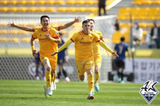 18일 인천 유나이티드전에서 득점한 뒤 세리모니를 펼치는 광주FC의 자시르 아사니 사진=한국프로축구연맹 제공 |