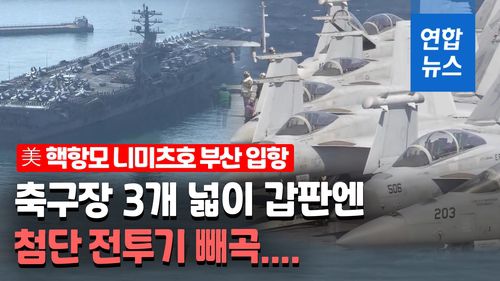 (서울=연합뉴스) '떠다니는 군사기지' 미국 핵 추진 항공모함 니미츠호(CVN-68)가 막강 전력을 자랑하며 부산 작전기지에서 모습을 드러냈습니다.