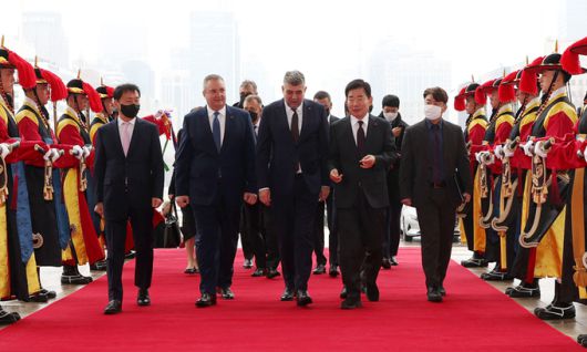 김진표 국회의장(왼쪽 네 번째)이 지난해 12월 서울 여의도 국회에서 이온 마르첼 치올라쿠 루마니아 하원의장(〃 세 번째)과 회담하기 위해 의장대 사열 속에 접견실로 향하고 있다. 국회 제공 |