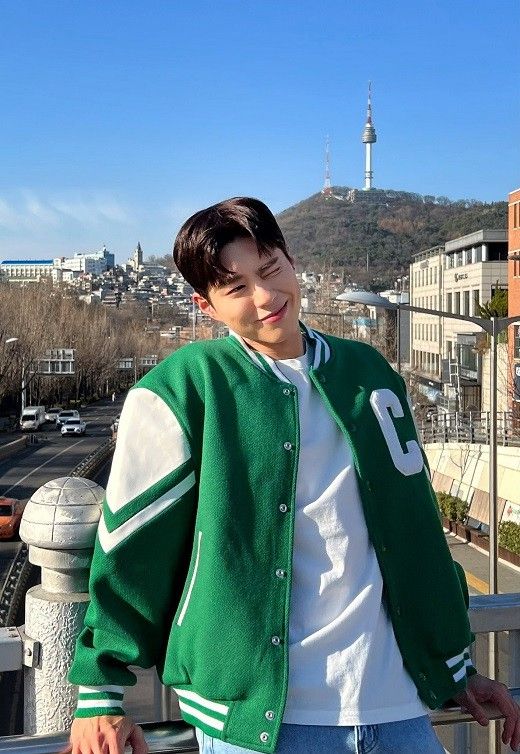 공개된 사진에는 초록색 바시티 자켓을 입고 포즈를 취하는 박보검의 모습이 담겼다. 한쪽 눈을 찡그리고 귀여운 표정을 짓고 있다.
