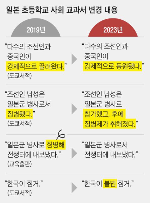 새 교과서엔 일제강점기 강제 징병·연행된 한국인에 대한 기술이 이전보다 약화하거나 모호한 표현으로 희석됐다. 점유율이 55%로 가장 높은 도쿄서적 6학년 사회 교과서는 징용과 관련해 ‘다수의 조선인과 중국인이 강제적으로 끌려왔다’고 표현했던 것을 ‘강제적으로 동원됐다’고 바꾸었다. 여전히 ‘강제적으로’라는 표현을 삭제하지 않고 그대로 쓰긴 했다. 하지만 연행한다는 의미의 ‘끌려왔다’를 ‘동원됐다’는 순화된 표현으로 대체했다. 같은 책에서 징병과 관련한 표현은 ‘일본군의 병사로서 징병되어’라고 한 문장을 ‘일본군의 병사로서 참가하게 되었으며 이후에는 징병제가 취해졌다’로 바꿨다. 교육출판의 교과서도 ‘일본군 병사로 징병해 전쟁터에 내보냈다’는 이전 기술을 ‘징병해’를 제외한 ‘일본군 병사로 전쟁터에 내보냈다’고 수정했다.