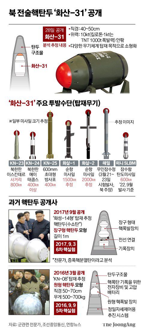 북한은 김정은이 새로 개발한 전술핵탄두 ‘화산-31’을 점검하는 장면을 공개하면서 벽면에 8종의 투발 수단에 소형 핵탄두를 장착한 그림 패널을 의도적으로 배치했다. 북한이 노출시킨 8종의 투발 수단은 최근 도발에 등장했던 600㎜ 초대형 방사포, 무인 수중공격정 해일, 화살-2 순항미사일, 화살-1 순항미사일, KN-24, KN-25, 미니 잠수함발사탄도미사일(SLBM) 등이다. 이들 모두가 새 전술핵의 운반 수단이 될 수 있다는 뜻이다. 또 사진에 전술핵탄두의 일련번호를 노출해 해당 무기들이 실제 운용되고 있음을 암시했다.