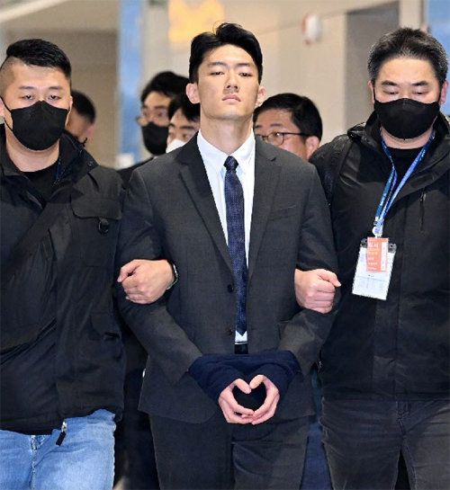 전두환 전 대통령 손자 전우원 씨(가운데)가 28일 인천국제공항에서 체포돼 서울경찰청 마약범죄수사대로 연행되고 있다. 인천=사진공동취재단 |