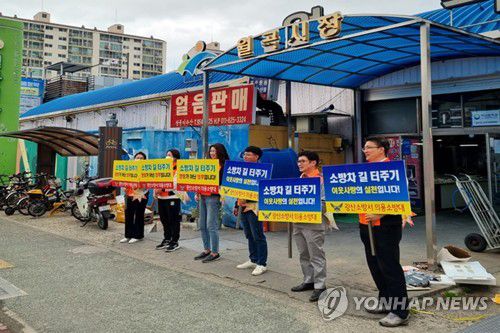(광주=연합뉴스) 29일 광주 광산구 월곡시장 입구에서 소방공무원과 의용소방대원이 소방차 길 터주기 문화 확산 운동을 하고 있다.