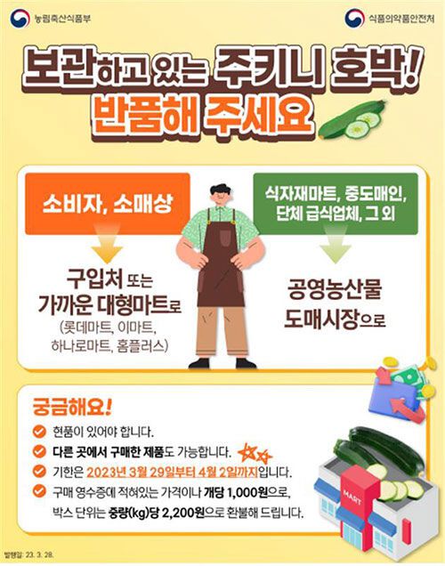 식품의약품안전처와 농림축산식품부에 따르면, 국내산 주키니 호박을 사서 보관 중인 소비자나 소매상은 29일부터 내달 2일까지 구매처나 가까운 대형마트(롯데마트, 이마트, 하나로마트, 홈플러스)에 호박을 반품하면 된다. 농산물 도매시장에서 주키니 호박을 구매한 식자재업체 등의 경우엔 해당 농산물 도매상에서 반품할 수 있다.