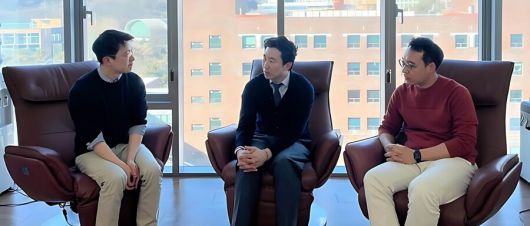 임지성 사우스벤처스 대표(왼쪽부터), 이종섭 서울대 교수, 이성은 클라이밋코인 매니저가 지난달 27일 서울대 경영대학 연구실에서 ‘블록체인과 ESG경영’을 주제로 대화를 나누고 있다. 선소미 코인데스크 코리아 기자 |