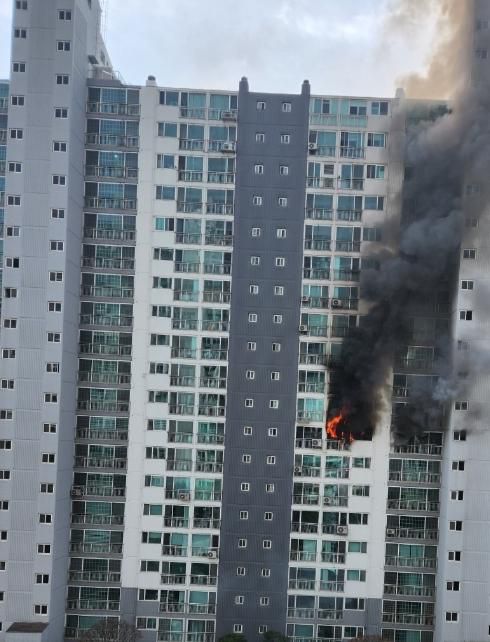 경기 용인시 수지구 한 아파트에서 29일 오후 불이나 윗층으로 옮겨 붙고 있다. 독자제공 |