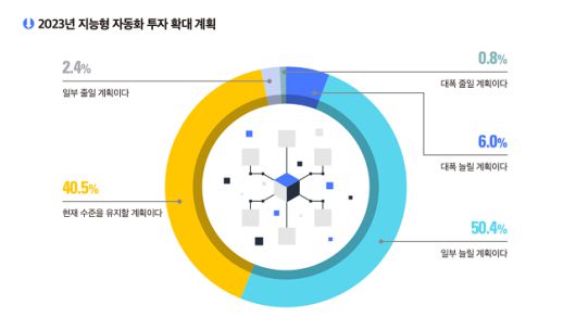 조사 결과에서 국내 기업 중 절반에 가까운 47.5%가 RPA를 도입해서 활용하고 있는 가운데, 향후 1년 내 도입 계획을 밝힌 기업은 10.7%이며, 도입을 고려 중인 기업도 33.2%로 나타났다. 이어서 향후 1년 간의 RPA 투자 계획을 묻는 질문에는 50.4%가 RPA에 대한 투자를 늘릴 것이라고 대답했으며, 40.5%는 현재 수준을 유지할 계획이라고 답했다.