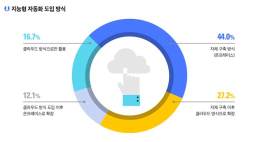 현재 국내 기업의 RPA 환경은 온프레미스 환경이 44.0%, 클라우드 환경은 16.7%의 비율을 이루는 것으로 나타났다. 온프레미스와 클라우드를 모두 활용하는 방식은 39.3%를 차지하며 일부라도 클라우드를 활용하는 환경은 총 56.0%다. 이제 막 RPA 활용을 시작해 특정 부서 일부 기능에 시험적으로 도입한 기업은 자체구축방식의 비중이 39.1%로 평균 이하였으며, 클라우드 방식으로만 활용한다는 응답은 18.8%로 평균보다 높았다. 도입을 고려 중인 기업 중에서는 25.1%가 클라우드 방식으로만 활용할 것이라고 답했다.
