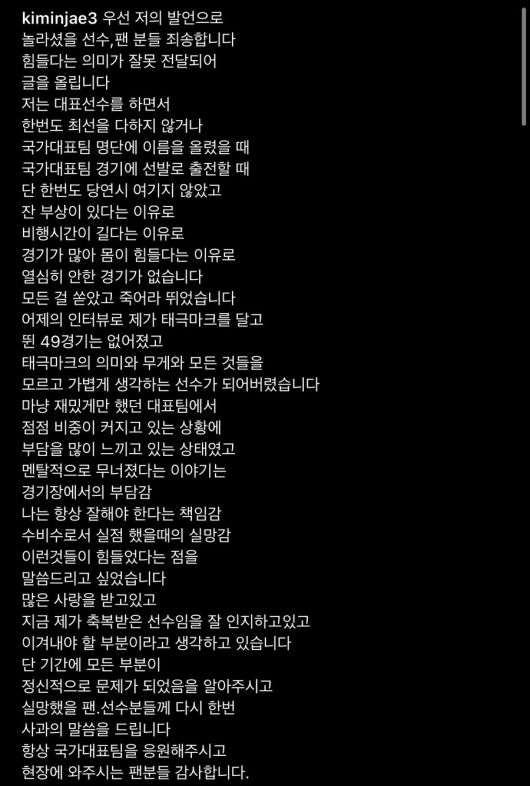 김민재는 29일 개인사회관계망서비스(SNS)를 통해 "저의 발언으로 놀라셨을 팬들께 죄송하다. 힘들다는 의미가 잘못 전달돼 글을 올린다. 항상 잘해야한다는 부담감, 책임감 등이 힘들었다는 걸 말하고 싶었다. 대표 선수로서 성숙하지 못한 점과 실망했을 팬들께 다시 한번 사과의 말씀을 드리고 싶다"고 밝혔다.