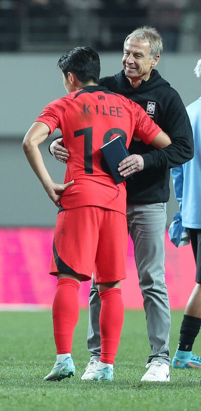 위르게 클린스만 축구대표팀 감독이 28일 서울월드컵경기장에서 열린 우루과이와의 평가전 뒤 이강인을 격려하고 있다. 연합뉴스 |