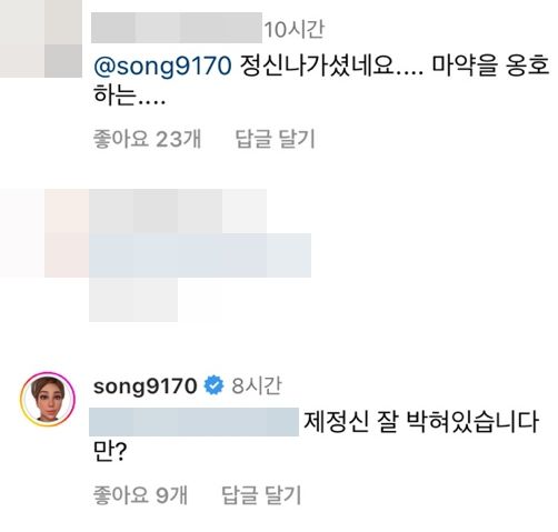이런 가운데, 한 누리꾼은 "정신 나가셨네요. 마약을 옹호하는..."이라는 댓글을 남겼다. 이에 김송은 29일 "제정신 잘 박혀있습니다만?"이라는 답글을 덧붙이며 설전에 나섰다.