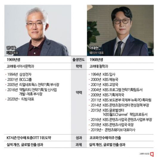 또 양지을 티빙 대표와 이태현 웨이브 대표는 고려대 동문이다. 1968년생인 이 대표는 철학과, 1969년생인 양 대표는 서어서문학과와 와튼스쿨을 졸업했다. 이 대표가 1살 연상이지만 졸업 연도는 1994년으로 같다. 종종 개인적으로 만날 만큼 가까운 사이다.