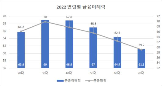 노인인 60대와 70대의 금융이해력 점수는 각각 64.4점, 61점으로, 30대(69점)와 비교해 최대 8점가량 차이가 발생했다.
