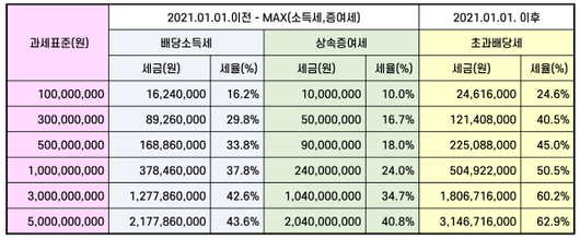 때문에, 2015년 12월 15일 세법을 개정하여 2016년 1월 1일부터 발생하는 초과 배당에 대해서는 소득세와 증여세를 비교하여 큰 금액을 부과하는 세금 체계로 개정된 것입니다. 위와 동일한 사례에 대하여 세법개정 이후 2,590,000,000원을 부과하게 된 것입니다.