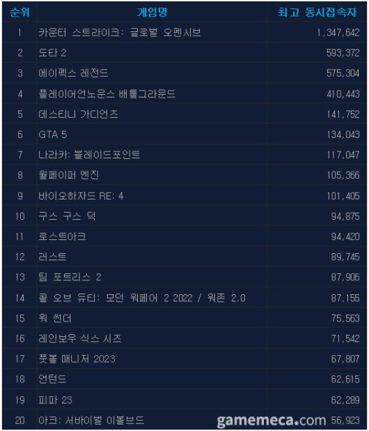 ▲ 3월 30일 오후 12시 기준 일 최고 동시접속자 TOP20 (자료출처: 스팀) |