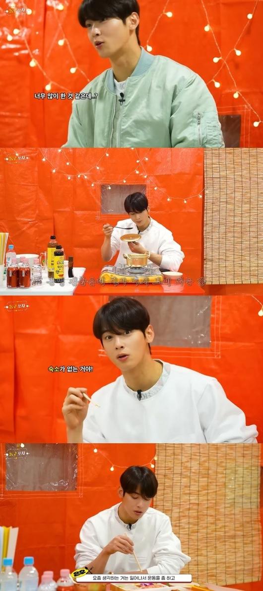 평소 혼밥을 잘 못한다며 "혼자 먹으면 쓸쓸하다"라고 했다. 차은우는 포장마차에서 제일 좋아하는 메뉴는 잔치국수라고 덧붙였다.