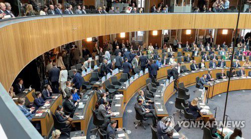 젤렌스키 연설에 퇴정하는 오스트리아 극우 의원들. 연합뉴스 자료사진. 재판매 및 DB 금지. |