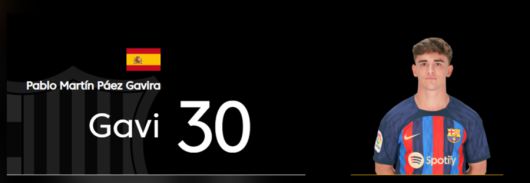 바르셀로나는 지난 1월 가비의 등번호 6번과 함께 1군 선수단에 등록했지만, 이날 스페인 프리메라리가 홈페이지엔 30번으로 바뀌어 있다.