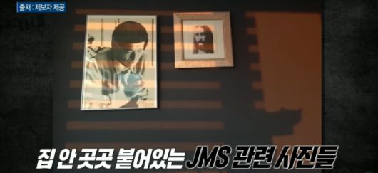 또 “저희 집에 돌아다니다 보면 다 정명석 얼굴이었다”며 “온 집안이 정명석으로 물들어 있었다”고 밝혔다. B씨가 공개한 사진을 보면 집 안에는 JMS 관련 사진이 가득 붙어 있다.